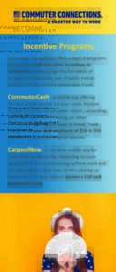 Commuter Connections offers a host of programs that provide cash and other incentives to commuters to encourage the formation of carpools and vanpools, the use of public transit, and other forms of more sustainable travel. Each program and their associated rewards are concisely summarized in this rack card.